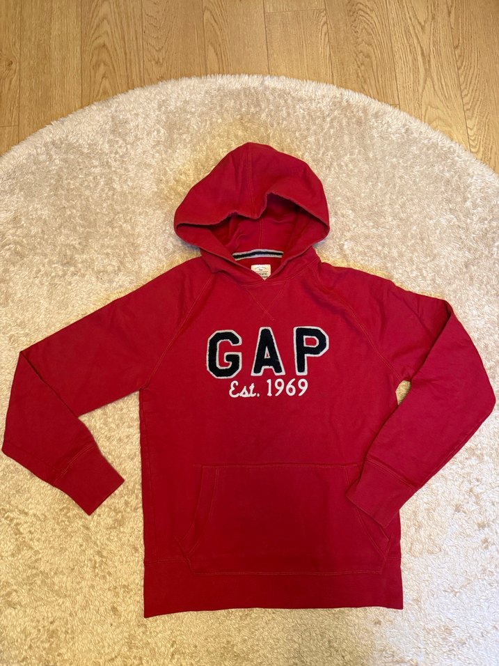 Kırmızı GAP sweatshirt, kapüşonlu ve uzun kollu. Önünde "GAP Est. 1969" baskısı var, yumuşak ve sıcak kumaştan yapılmıştır.
