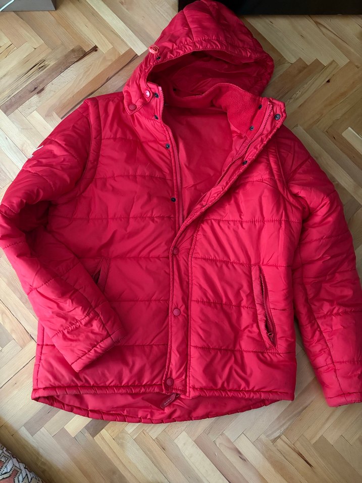 Kırmızı, kapüşonlu ve fermuarlı, uzun kollu kadın kışlık ceket. Rahat ve sade tasarımıyla günlük kullanıma uygundur. Unisex kullanılabilir
