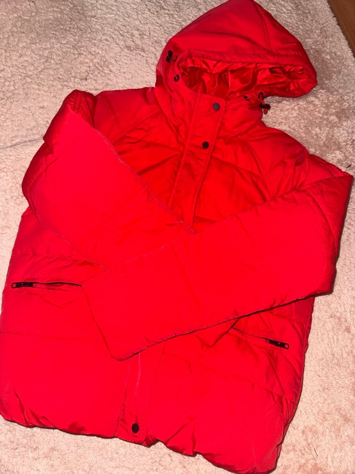 Yumuşak ve sıcak kumaştan, kapüşonlu, yüksek yakalı, uzun kollu kırmızı kadın kış montu. Midi boy ve dar kesim, gençler için rahat dış mekan kullanımı sağlar. ❄️