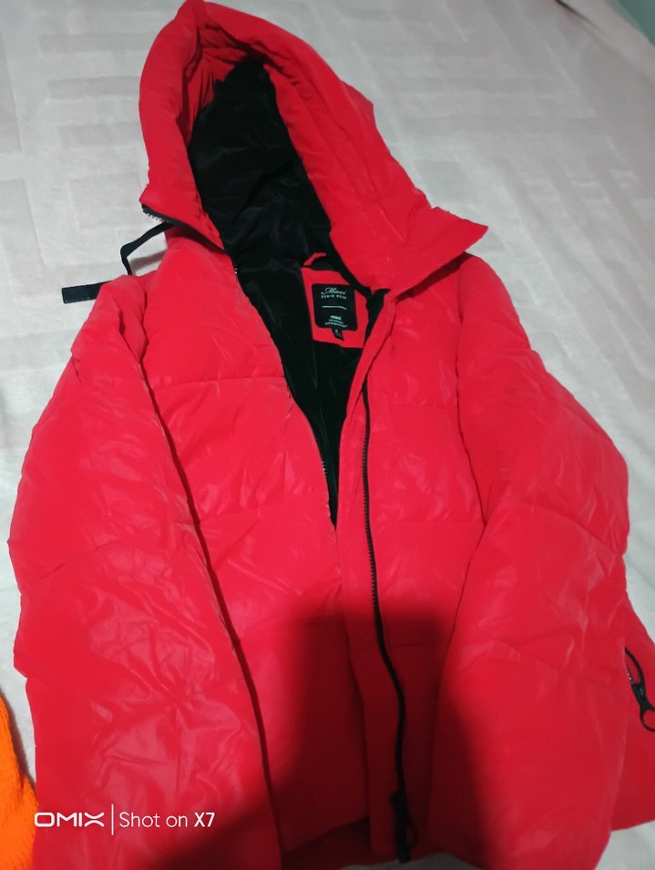 Kapüşonlu ve fermuarlı, kırmızı renkli, yumuşak ve sıcak tutan bir mont sadece 1 kere giydim baza altındaydı resimde de gösterdim icinde küçük bir leke var baza altinda kalmaktan dolayı oldu galiba yıkanınca geçer