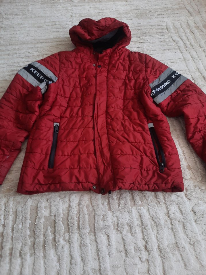 Kırmızı kapüşonlu, fermuarlı ceplere sahip kadın kışlık mont. Yumuşak ve sıcak kumaştan üretilmiş, sade desensiz tasarım.