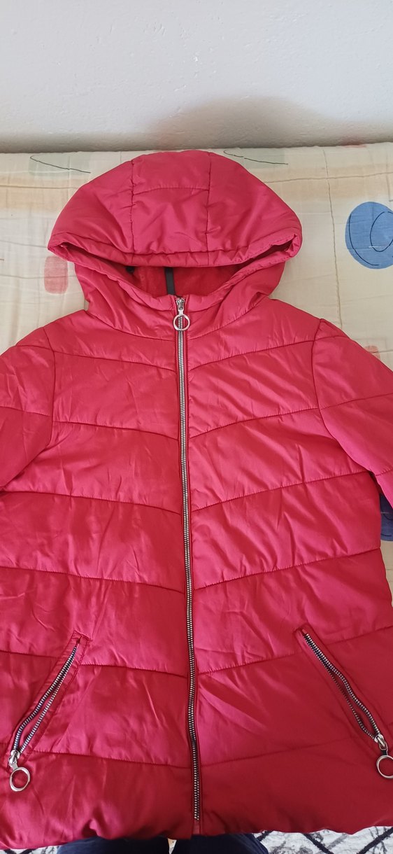 Fermuarlı ve kapüşonlu, kırmızı renkli, yumuşak, normal boyda, sade tasarımlı kadın kışlık mont. Rahat ve şık, günlük kullanıma uygun.