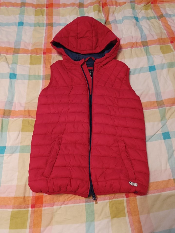 Kırmızı kapüşonlu, fermuarlı ve kolsuz olan bu şişme yelek, rahat ve sıcak kumaştan yapılmıştır. Fit kesimdir ve günlük kullanım için uygundur. son fotoda iki minik leke yıkanınca çıkar diye düşünüyorum