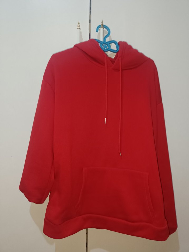 Kırmızı kapüşonlu kadın sweatshirt, uzun kollu ve rahat kesimlidir. Yumuşak ve sıcak kumaştan yapılmıştır, günlük kullanım için uygundur.