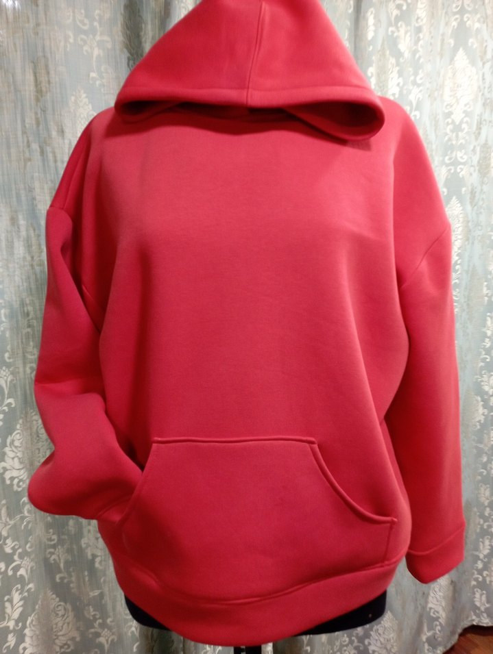 Yumuşak ve sıcak kumaştan, kapüşonlu ve uzun kollu kırmızı bol kesim sweatshirt. Ön cepli ve yuvarlak yaka, rahat sokak stili için ideal.