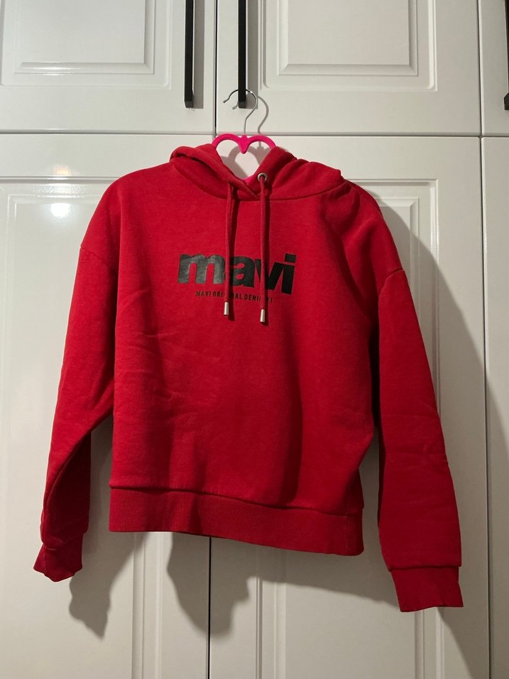 Kırmızı kapüşonlu, uzun kollu kadın sweatshirtü, yumuşak fleece kumaş ve örme dokusuyla dikkat çeker. Önde 'mavi' yazılı koyu baskı bulunur, günlük kullanım için uygundur.