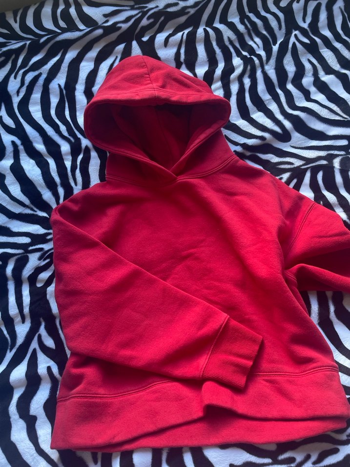 Kırmızı kapüşonlu sweatshirt, uzun kollu ve rahat kesimdir. Yumuşak ve sıcak kumaşıyla günlük kullanıma uygundur.