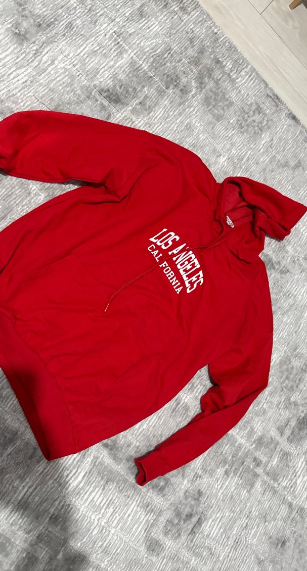 Kırmızı kapüşonlu kadın sweatshirt, bol kesim ve uzun kolludur. Fermuarlı ön kısmı ve 'Los Angeles California' baskısı bulunur. Yumuşak ve sıcak kumaştan üretilmiştir. Hic giymedimmm