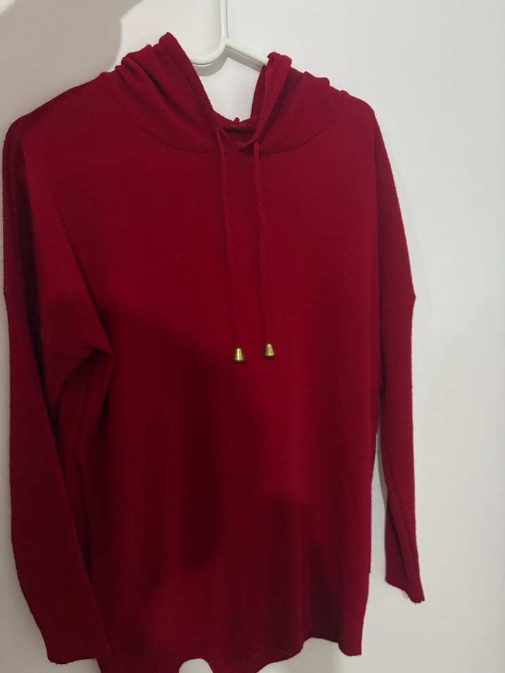 Kırmızı, kapüşonlu kadın , yuvarlak yakalı ve uzun kolludur. Rahat kesimi ve parlak dokusu ile günlük sokak stiline uygundur.