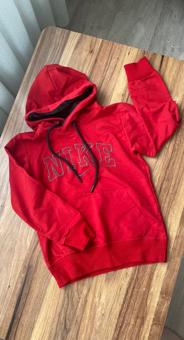 kırmızı kapüşonlu sweatshirt, bol kesim ve uzun kolludur. Yumuşak kumaştan üretilmiş, baskılı logo ve ipli kapüşon detayına sahiptir. 7-8 yaş. Çok iyi durumda hiç giyilmedi.