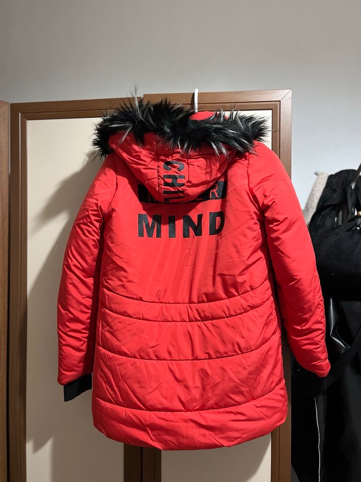 Kırmızı, kapüşonlu ve kürklü detaylı, baskılı yazılı sırt kısmı olan, uzun kollu, normal midi boyda, günlük kullanıma uygun, fitted kesim kadın kış montu.
