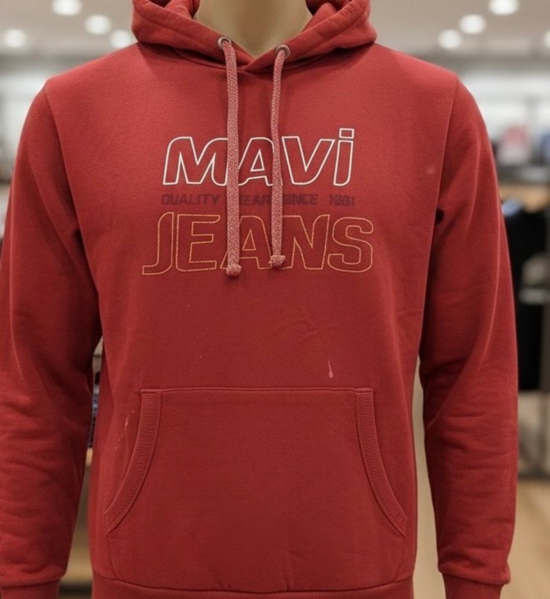 Kırmızı kapüşonlu sweatshirt, bol kesim ve uzun kolludur. Renkli baskılı "Mavi Jeans" yazısı ve fermuarlı detay içerir. Yumuşak kumaştan üretilmiştir.