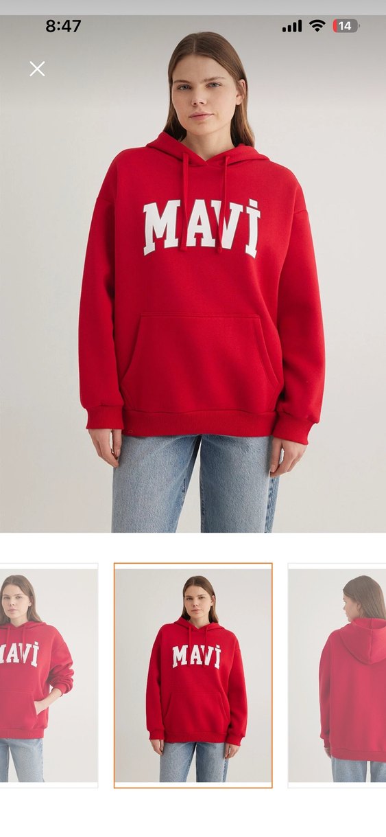 Kırmızı, kapüşonlu ve uzun kollu, rahat kesim kadın sweatshirt. Önde beyaz baskılı 'MAVI' yazısı ve kanguru ceplidir. Günlük kullanıma uygun.
