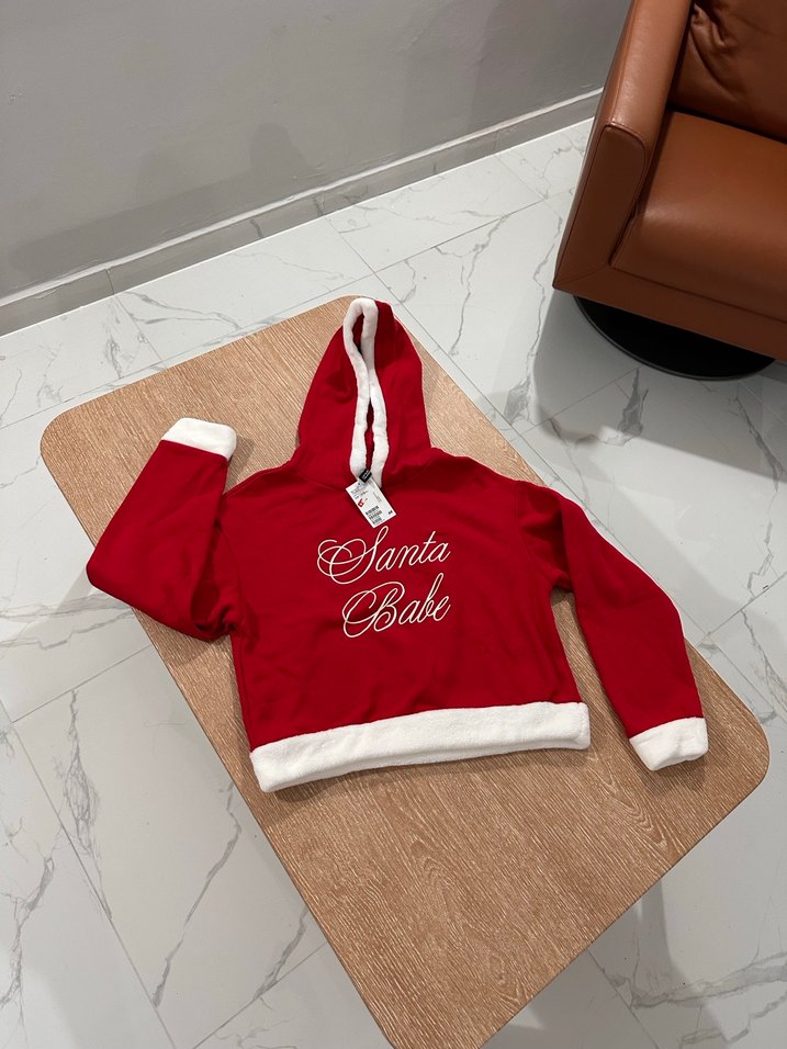 Kırmızı kapüşonlu, uzun kollu, mini kesim ve örme dokulu sweatshirt. Üzerinde "Santa Babe" baskısı vardır, rahat sokak stili için uygundur.