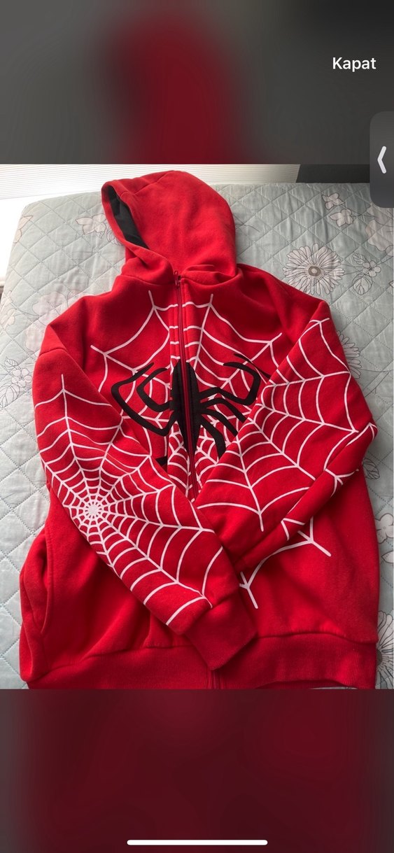 Kırmızı Kapüşonlu Örümcek Desenli Fermuarlı Sweatshirt