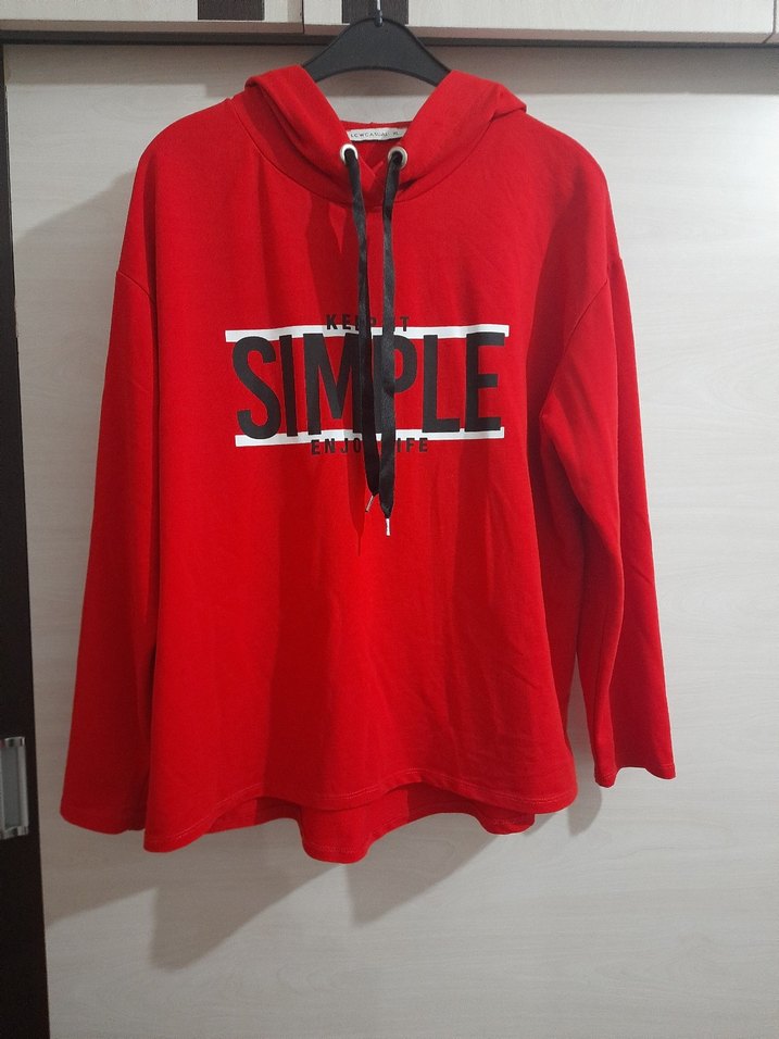 Kırmızı renkte, uzun kollu ve bol kesimli sweatshirt. Üzerinde "SIMPLE" yazılı renkli baskı vardır, yumuşak pamuklu kumaştan üretilmiştir. iki koltuk arası 60cm boy 70cm dir