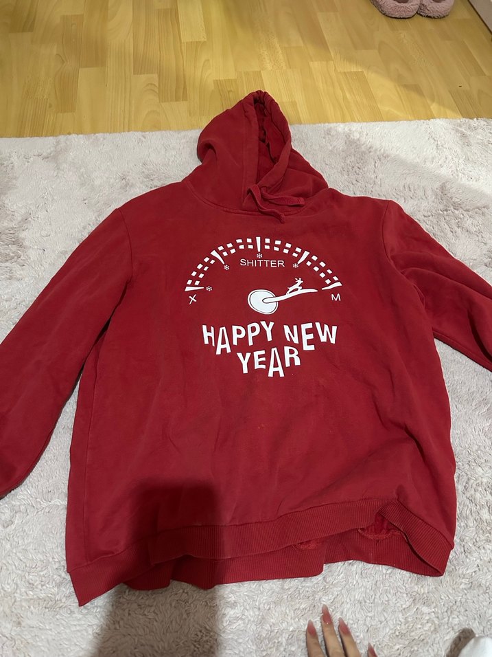 Kırmızı kapüşonlu sweatshirt, uzun kollu ve bol kesimdir. "HAPPY NEW YEAR" baskısı bulunur ve yumuşak, sıcak bir kumaştan üretilmiştir.