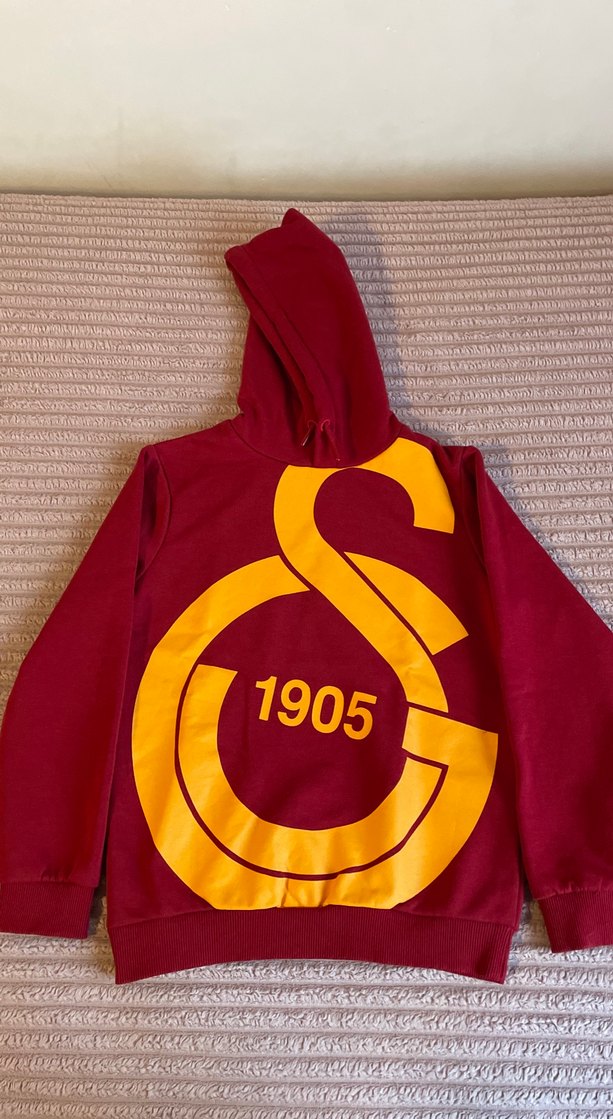 Kapüşonlu ve uzun kollu, bol kesim erkek sweatshirt. Yumuşak ve sıcak kumaştan, parlak kırmızı renkte, büyük sarı baskılı detay ve zincir süslemeli. Önde 1905 sayısı bulunur.