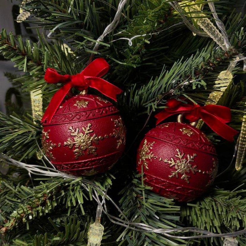 Altın renkli kar tanesi desenleri ve kırmızı kadife kurdeleli yılbaşı süsleri, yeşil ağaç dalında asılıdır.