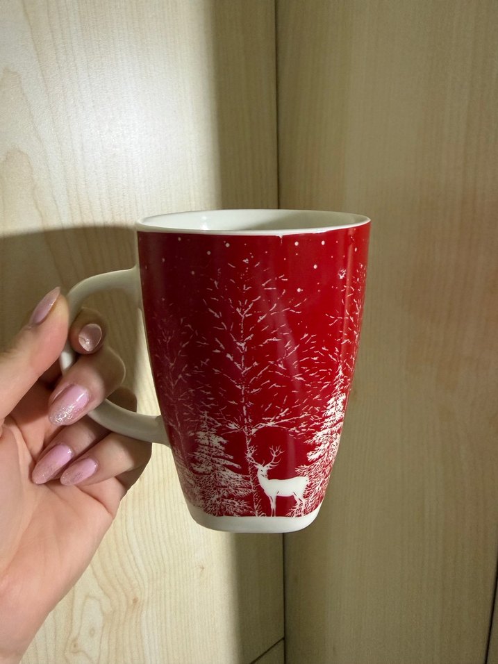 Canlı kırmızı renkte, beyaz kış ormanı ve geyik desenli seramik kupa, sıcak anlar için uygundur. ☕