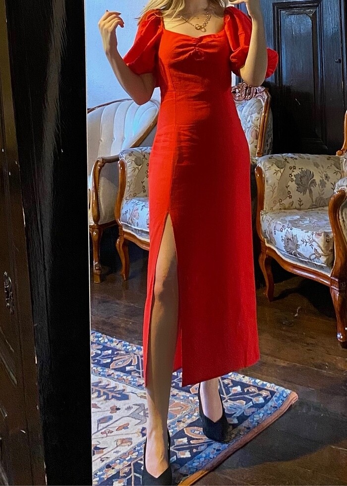 Kırmızı kare yaka keten elbise