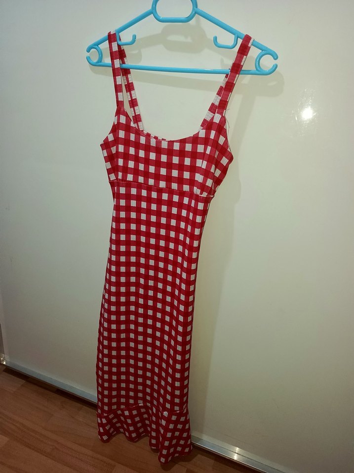 Kırmızı beyaz kareli, askılı, midi elbise. Hiçbir sorunu yok.