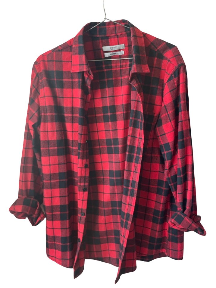 Kadınlar için koyu kırmızı kareli desenli, uzun kollu, düğmeli ve notched lapel yakalı gömlek. Rahat kalıp ve yumuşak sentetik kumaştan, günlük kullanıma uygun.