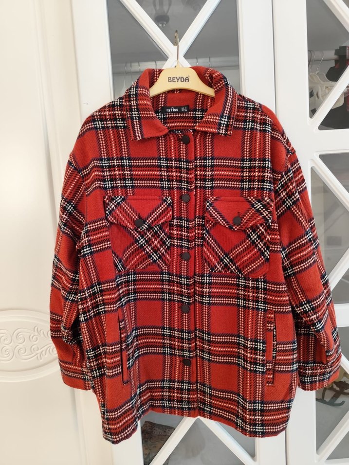 Kırmızı kareli, düğmeli kadın gömlek, uzun kollu ve yakalıdır. Bol kesim, kısa boy ve yumuşak, sıcak kumaştan üretilmiştir. Günlük kullanım için uygundur.