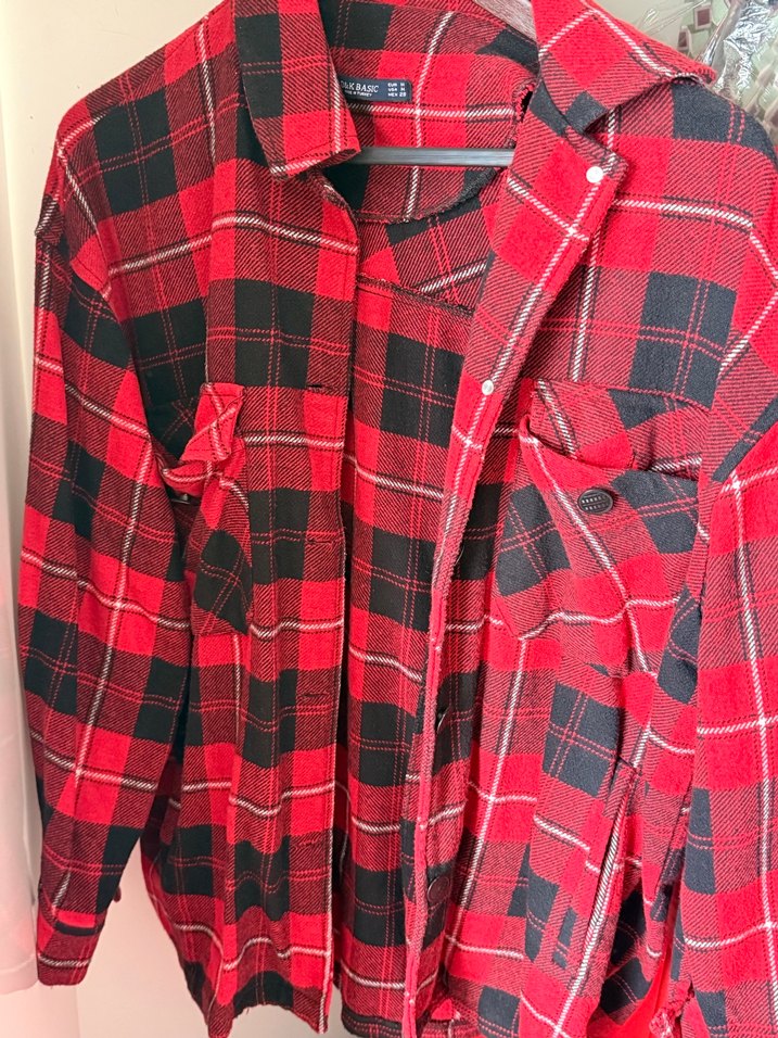 Düğmeli, uzun kollu, kırmızı kareli kadın gömlek. Yumuşak tekstil malzemeden üretilmiş, rahat kesimli ve günlük kullanıma uygun.