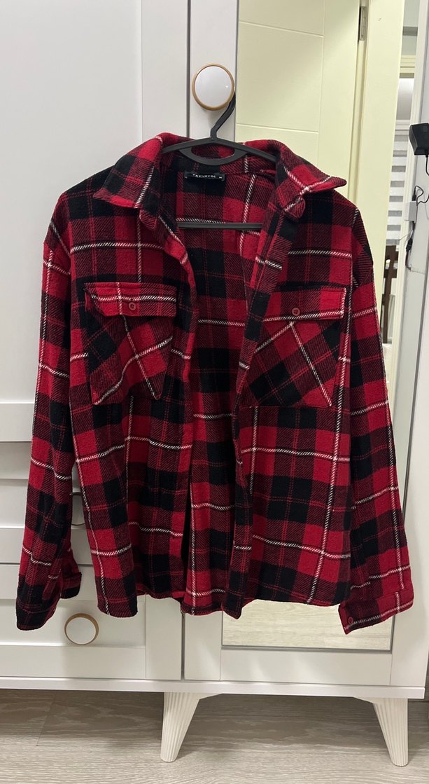 Koyu kırmızı kareli desenli, uzun kollu, düğmeli kadın gömleği. Yumuşak ve sıcak kumaştan, rahat kesim ve çıtçıtlı ceplerle sokak stiline uygun.