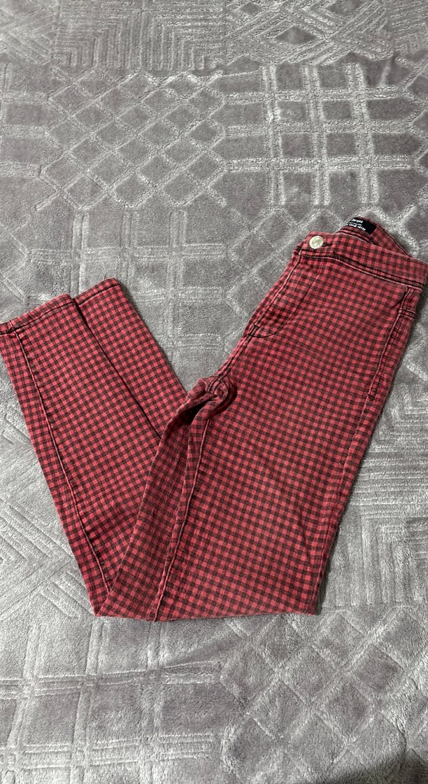Kırmızı Kareli Düğmeli Kadın Pantolon