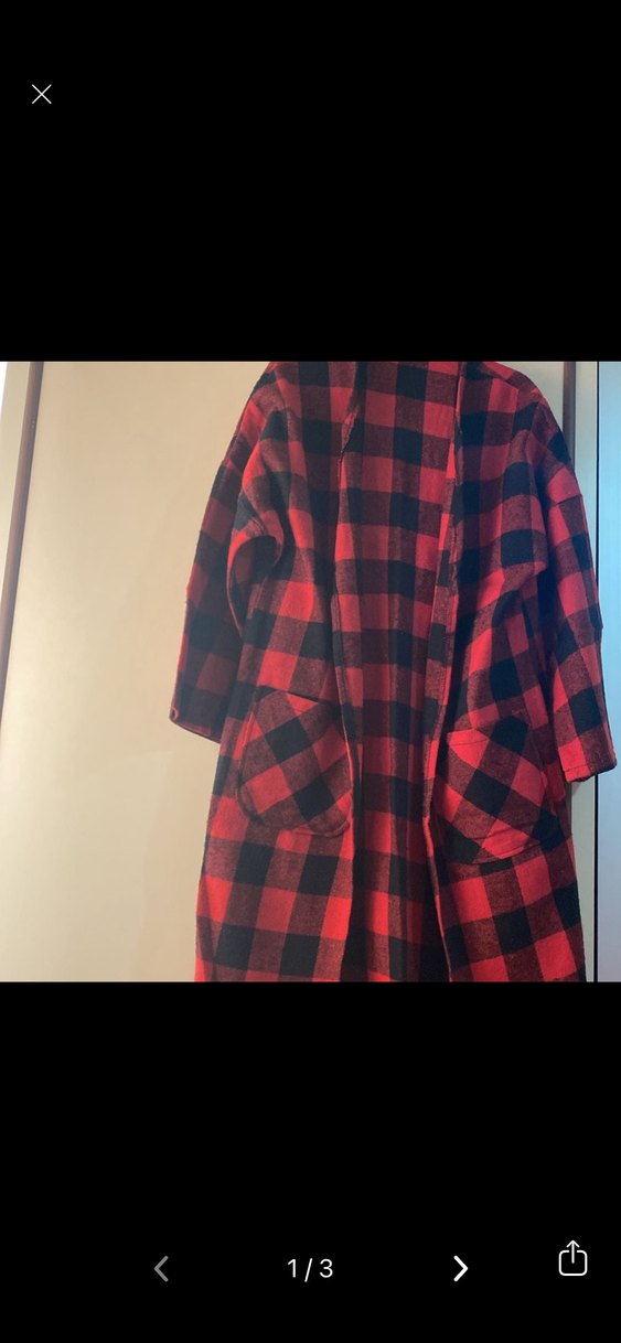 Yumuşak ve sıcak kumaştan, uzun ve bol kesim, kırmızı kareli düğmeli kadın gömleği. Notch yakalı, günlük rahat kullanıma uygun.