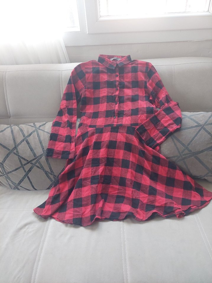 Renkli kırmızı kareli, düğmeli önü, yakalı ve uzun kollu, bol kesim kadın gömleği. Normal midi boyda, sentetik kumaştan günlük kullanıma uygun.