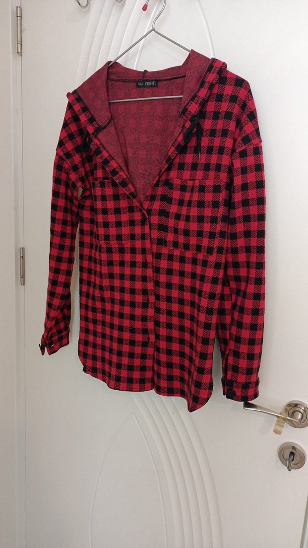 Koyu kırmızı kareli, notalı yaka ve düğmeli ön kapamalı kadın gömleği. Uzun kollu, bol kesim ve yumuşak sentetik kumaştan midi boyda, günlük rahat kullanım için uygundur.