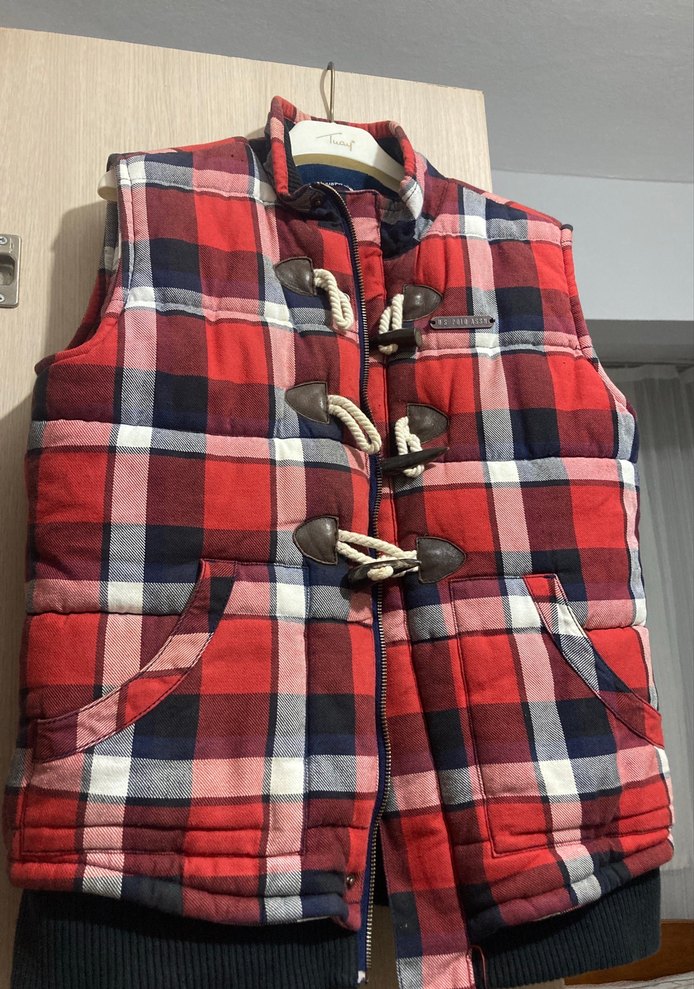 Kırmızı kareli, kapitone erkek yelek, askısız ve halter yakalıdır. Tokalı ön kısmı ve yumuşak, sıcak kumaşı ile günlük kullanıma uygundur.