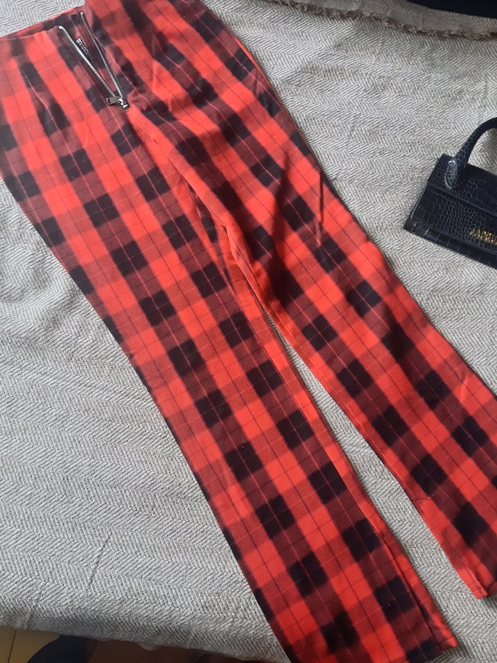 Koyu kırmızı kareli, fermuarlı, regular fit kadın kumaş pantolon.Rahat ve günlük kullanım için uygun. Xs-s beden uyumlu