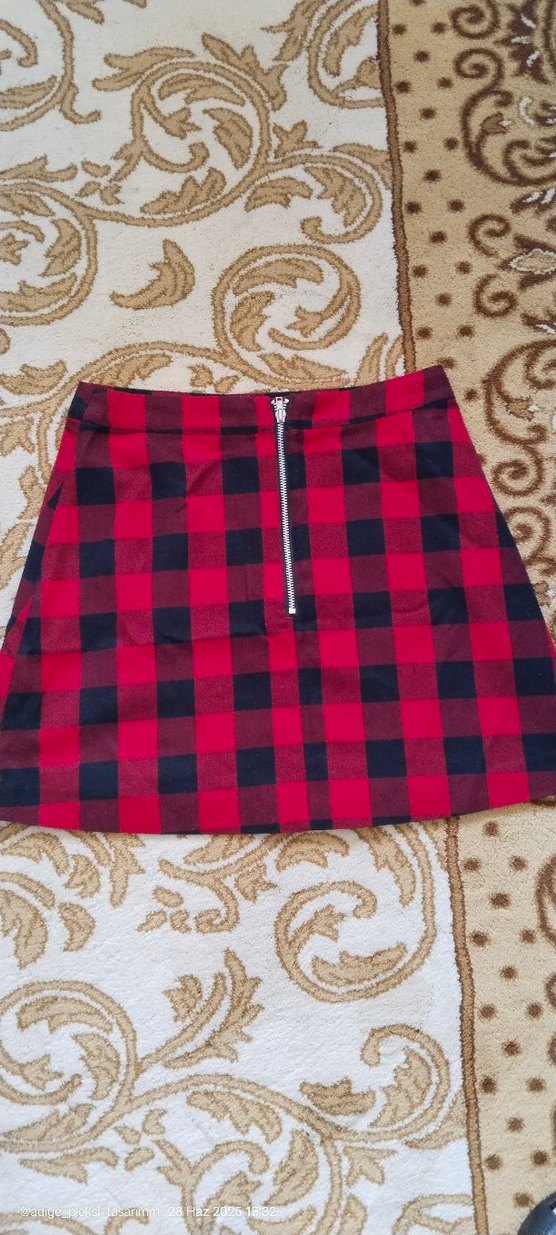 Kırmızı kareli, ön fermuarlı, sentetik kumaştan yapılmış, rahat kesim mini etek. ️