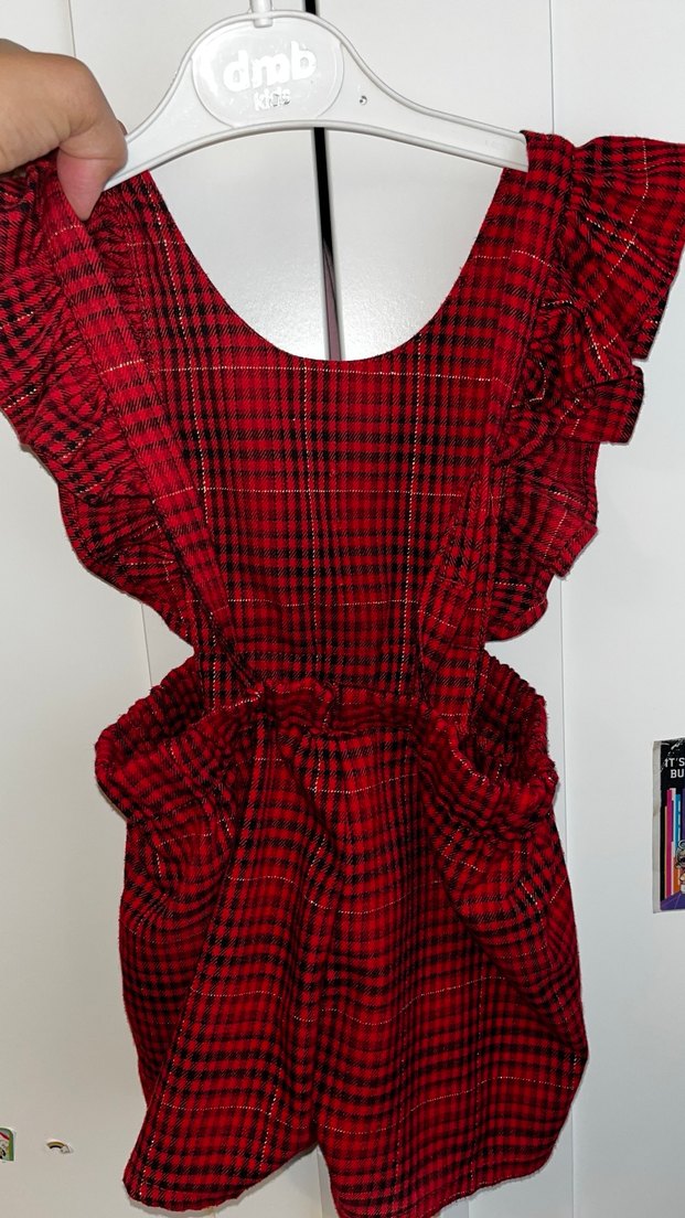 Kırmızı kareli kız elbisesi, fırfırlı detaylara, salaş kesime, yuvarlak yaka ve askılı kollara sahiptir. Kumaşı tekstil ve koyu canlı renklidir. Şortludur