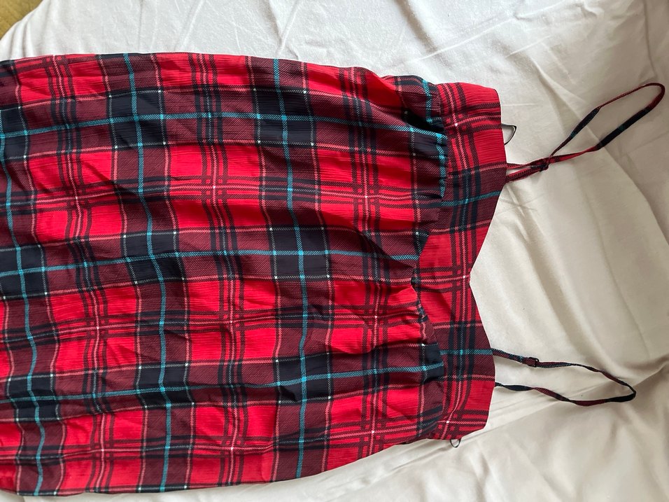 Koyu kırmızı kareli desene sahip, klasik tasarımlı S beden şifon elbise