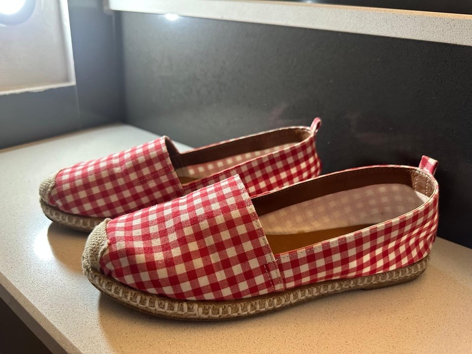 Kadınlar için kırmızı kareli tekstil üst kısmı, pliseli detaylar ve dolgu topuklu espadril ayakkabılar. Renkli tasarımıyla günlük kullanıma uygun.