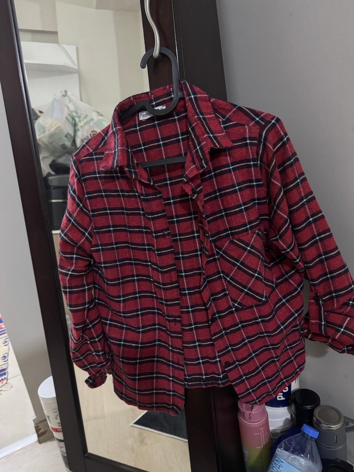 Koyu kırmızı kareli kadın gömlek, düğmeli ön, uzun kollu ve kesik yakalıdır. Rahat kesim ve midi boyda, sentetik kumaştan üretilmiştir. Günlük kullanım için uygundur.