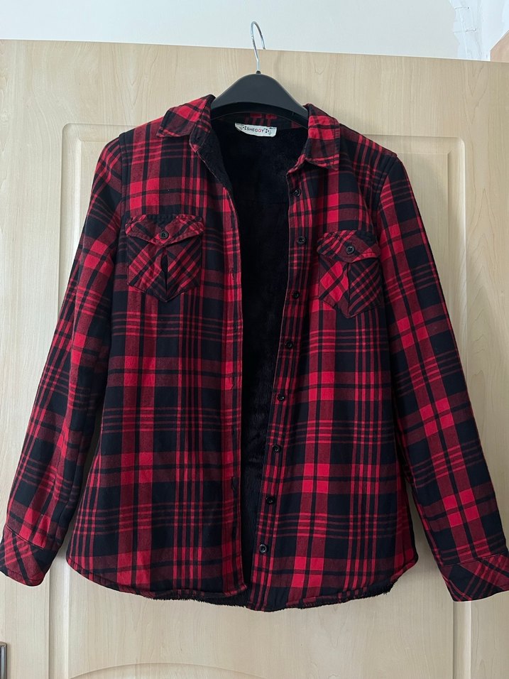 Düğmeli ön ve yakalı, uzun kollu, bol kesim kırmızı kareli kadın gömleği. Yumuşak ve sıcak kumaştan, günlük rahat kullanım için uygundur.