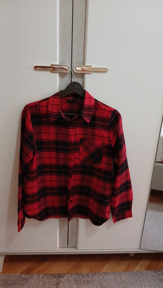Koyu kırmızı kareli, yakalı ve düğmeli önlü kadın gömlek. Uzun kollu, bol kesim ve yumuşak, sıcak kumaştan üretilmiştir. Günlük kullanım için uygundur.