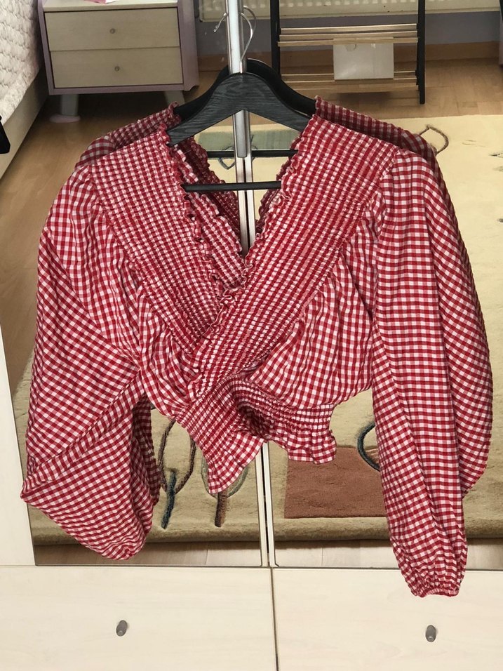 Kırmızı kareli keten bluz, uzun kollu ve V yaka. Düğmeli ön kısmı, bol kesimi ve kısa boyu ile rahat bir tarz sunar. Günlük kullanım için uygundur. S-m uyumludur.
