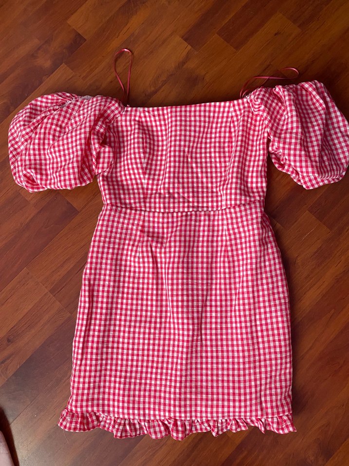 Kırmızı kareli mini elbise, balon kol ve tekne yaka detaylarına sahiptir. Etek ucu fırfırlı ve yumuşak sentetik kumaştan üretilmiştir. Hiç kullanılmadı