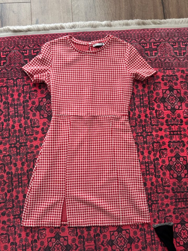Kısa kollu, bisiklet yaka, kırmızı kareli mini elbise. Fitted kesimi ve fırfır detaylarıyla günlük sokak stiline uygundur.