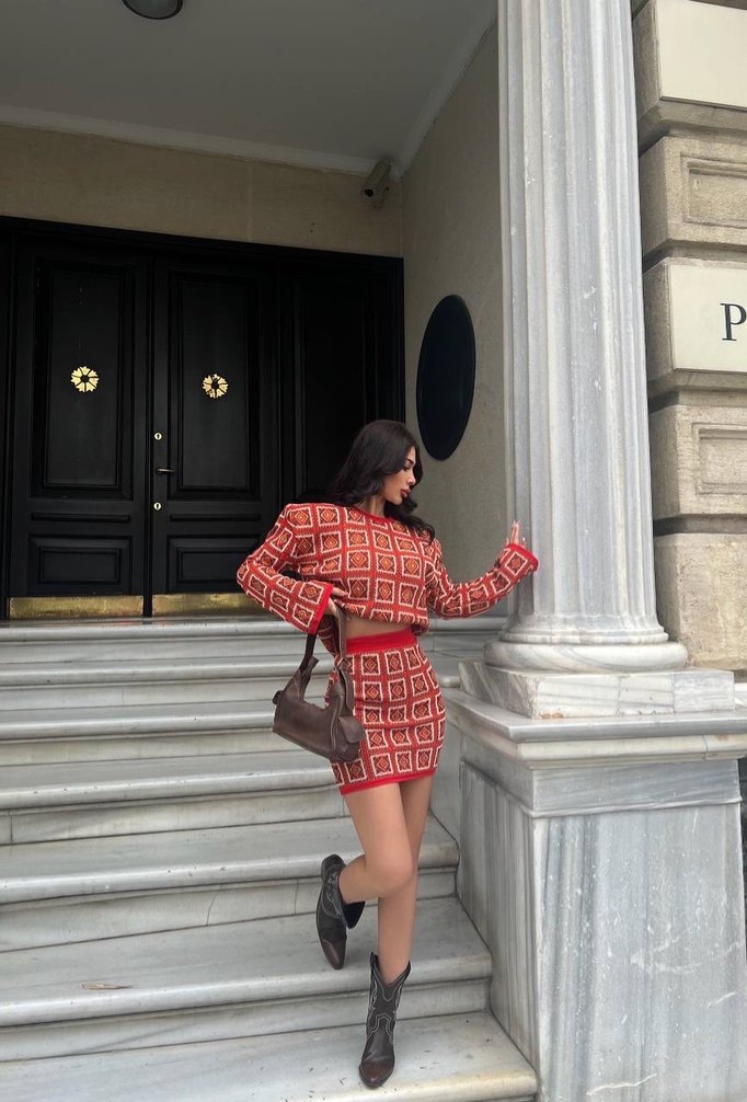 Parlak kırmızı etekli takım elbise, uzun kollu, yüksek yakalı ve kemerli, sokak stilini cesur detaylarla birleştiriyor.