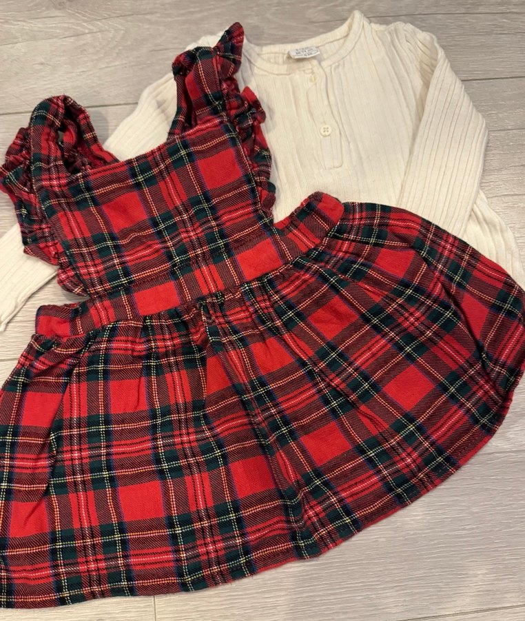Koyu kırmızı kareli örme kumaştan, askılı ve bol kesim kız elbisesi, krem rengi yuvarlak yakalı iç bluzla kombinlenmiştir.