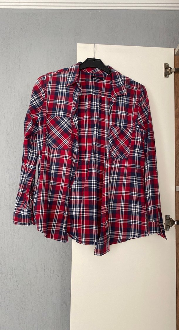 Uzun kollu, düğmeli ve yakalı kadın gömleği. Pamuklu, rahat kesim, midi boy ve koyu kırmızı kareli desene sahip. Günlük sokak giyimine uygun.