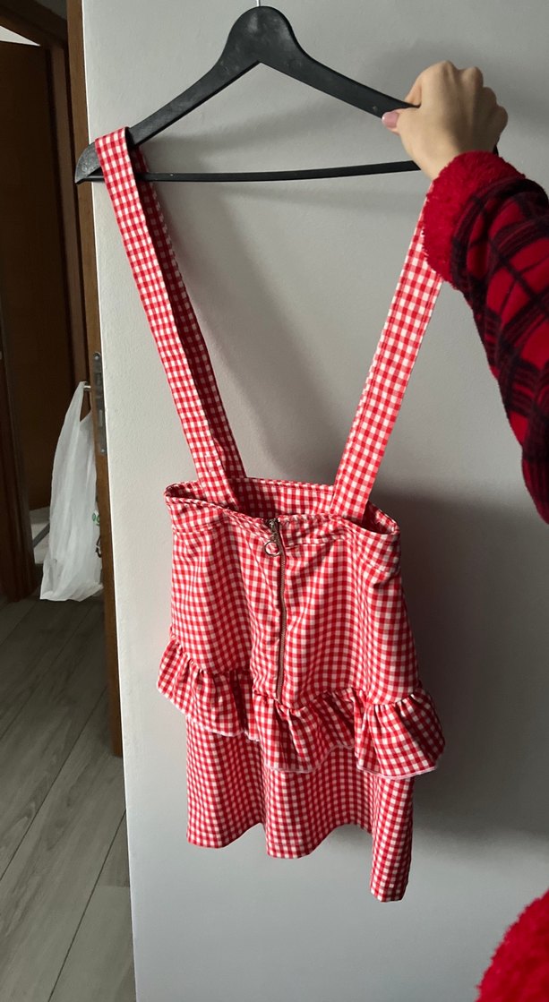 Hafif kırmızı kareli desene sahip, ayarlanabilir askılı ve fırfırlı etek , şık bir dokunuş katıyor.